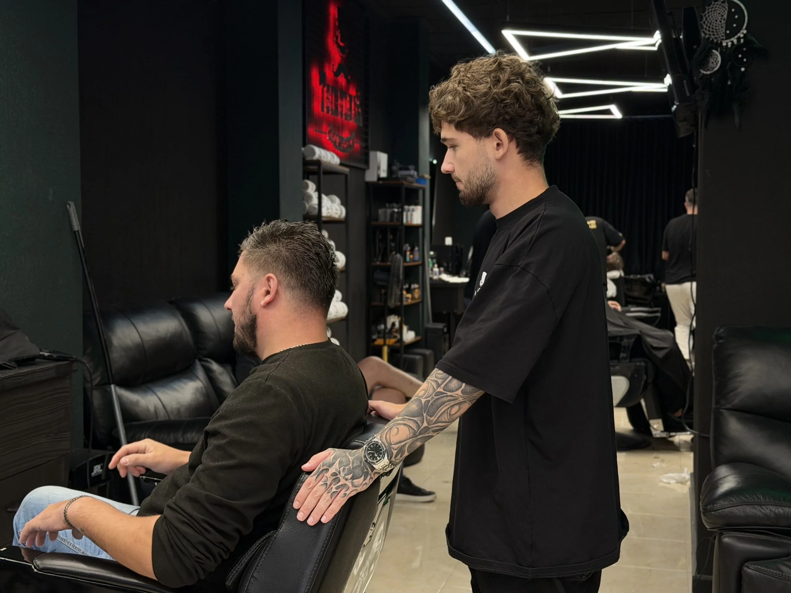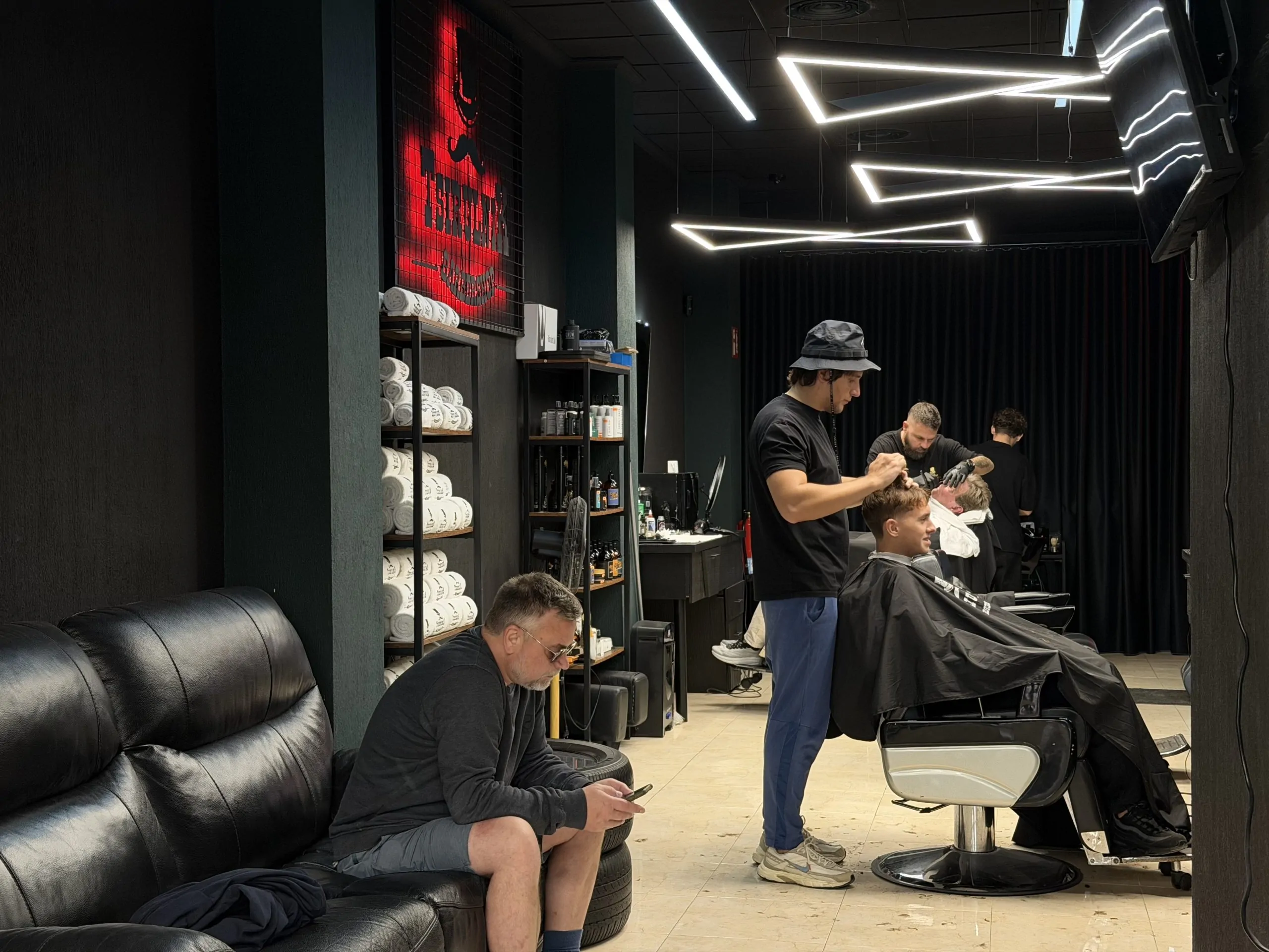 Al entrar, se sumergirá de inmediato en una atmósfera especial que combina elegancia y comodidad. Nuestro interior ha sido diseñado hasta el más mínimo detalle: los sofás de cuero invitan a relajarse y el diseño moderno crea un ambiente agradable. Ofrecemos no solo cortes de cabello, sino también una zona de estar donde podrá disfrutar de una selección de bebidas, desde un aromático café y refrescos hasta un vaso de whisky o una cerveza fría.